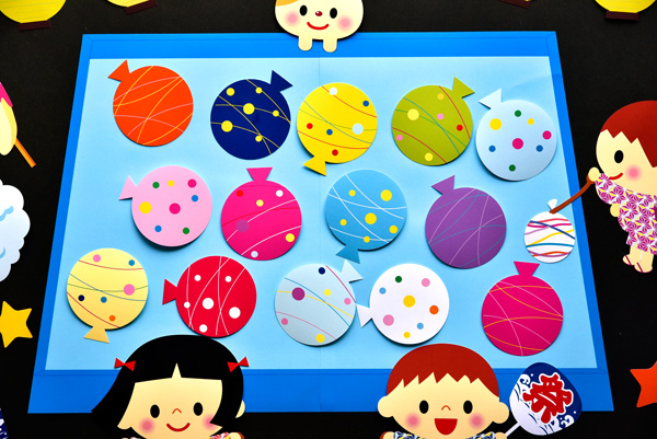 子供たちが夏祭りを楽しんでいる壁面飾りです!