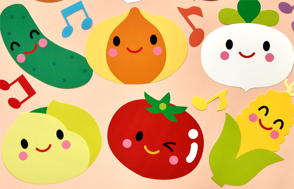 野菜が楽しく踊っている壁面飾りです!じゃがいも、だいこん、さつまいも、ピーマン、きゅうり、たまねぎ、かぶ、にんじん、キャベツ、トマト、トウモロコシ、なすがあります。