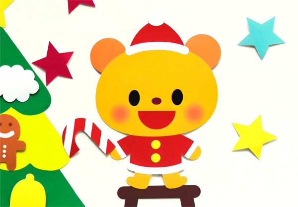 動物たちがクリスマスツリーの飾りつけをしている壁面飾りです。