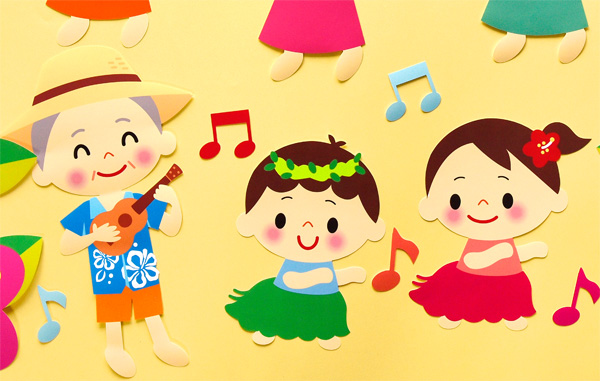 おばあちゃんとおじいちゃんと孫が南国でフラダンスをしている壁面飾りです!