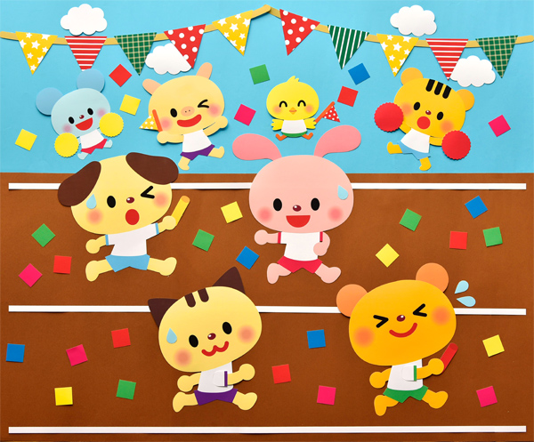 ★壁面飾り工房【横80cm】「動物たちの運動会!」9月 10月 11月 秋 幼稚園 保育園 学校 病院 施設 知育 壁面装飾 型紙 製作★